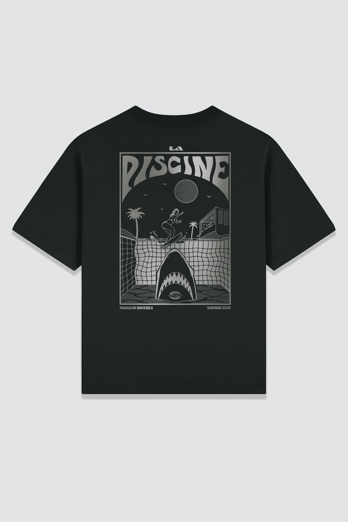 On the back, a large "La Piscine" screen print — a woman surfing in a pool, with a shark underneath.