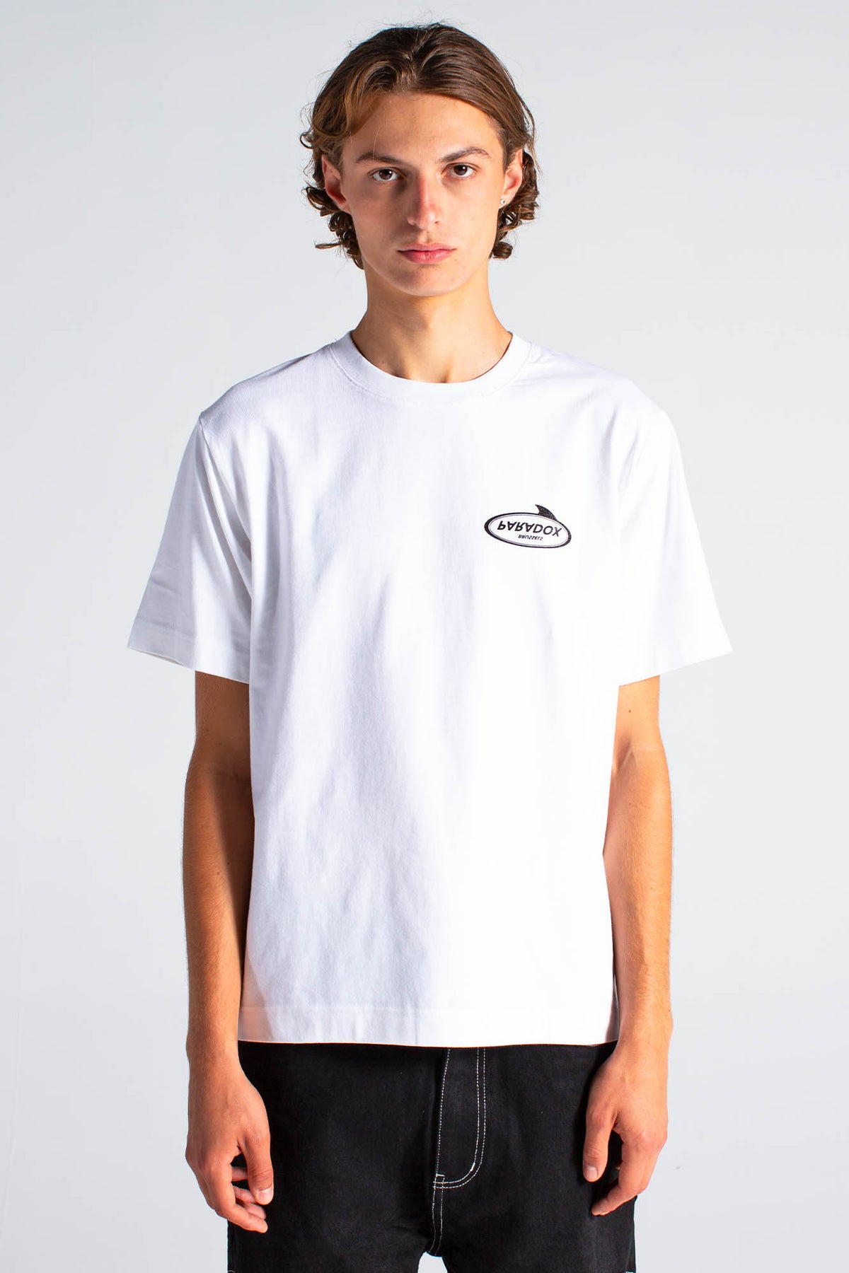 White cotton T-shirt with a black Paradox Brussels print over the heart. On the back, a large "La Piscine" screen print — a shark swimming in a pool.