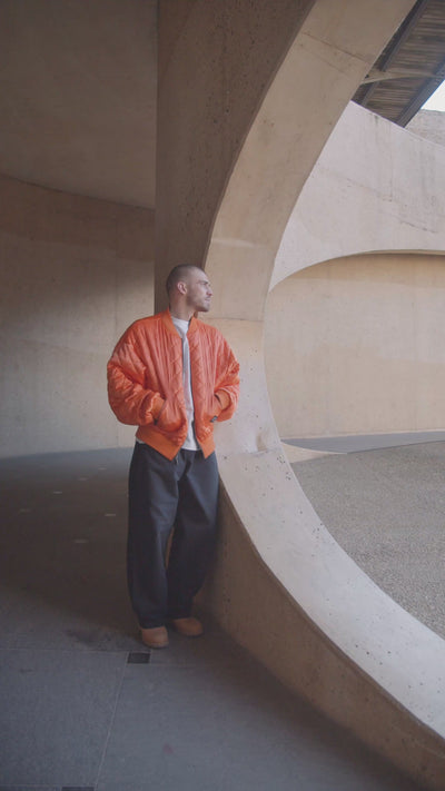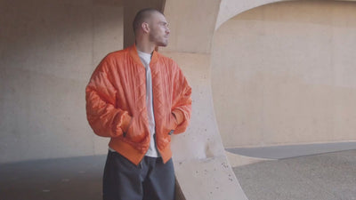 This jacket was designed by Milan Quadens, co-founder of the brand, inspired by the history of traditional American bombers from the 1950s, which featured a khaki side for camouflage and an orange side for visibility in case of emergency.