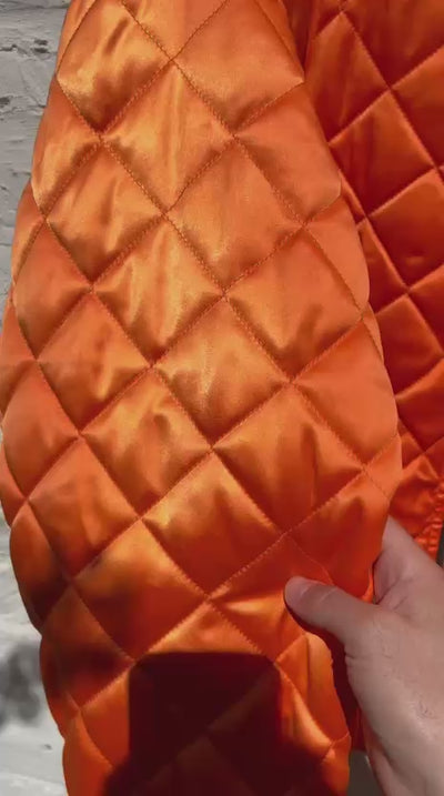 The other side is orange quilted satin with two zippered pockets.