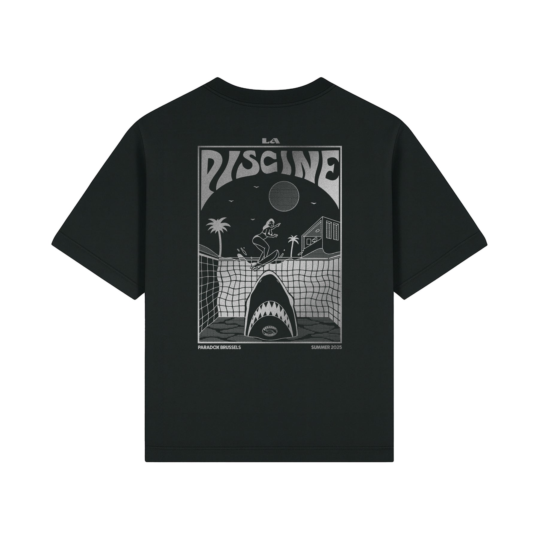 On the back, a large "La Piscine" screen print — a woman surfing in a pool, with a shark underneath.