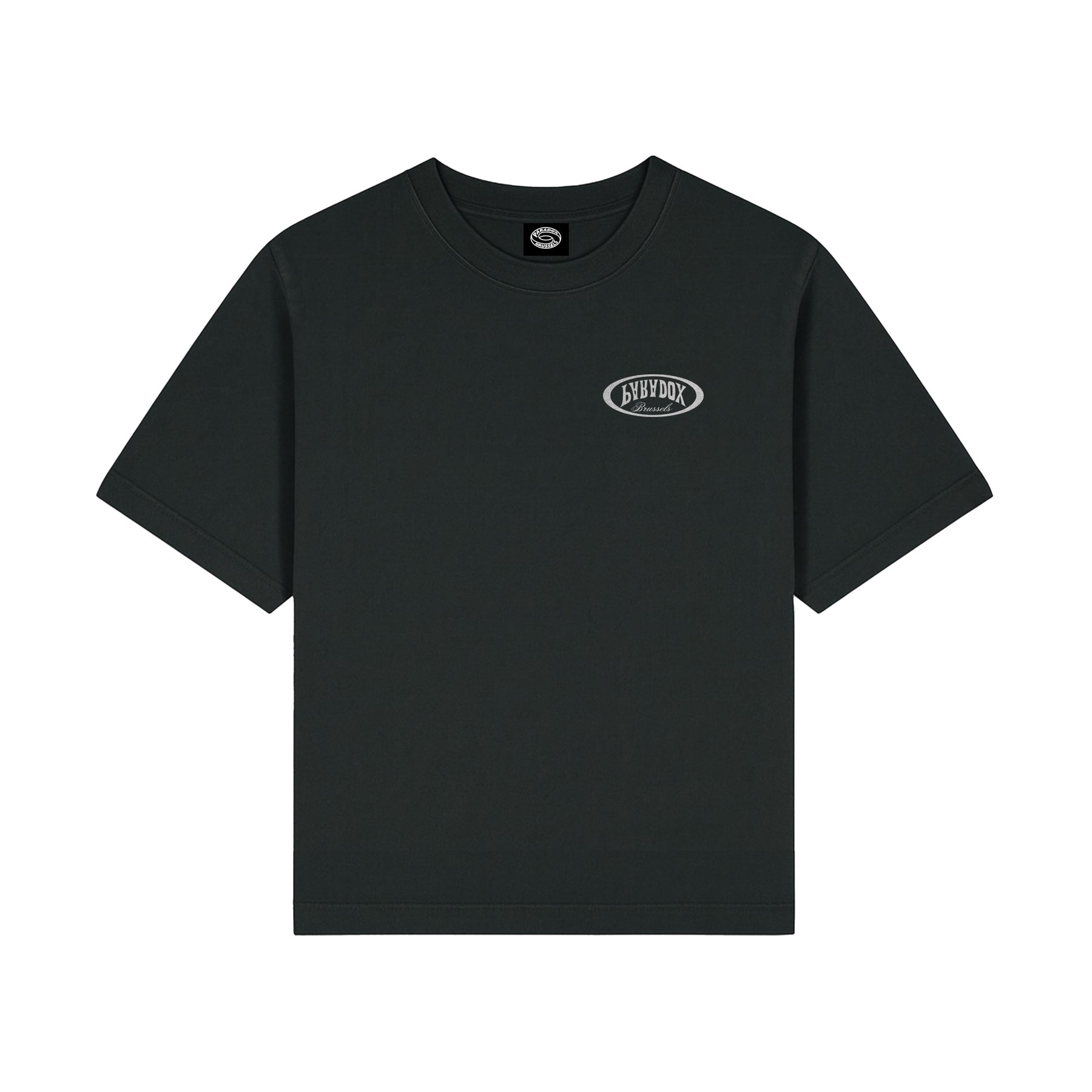 Black cotton T-shirt with a grey Paradox Brussels print over the heart.