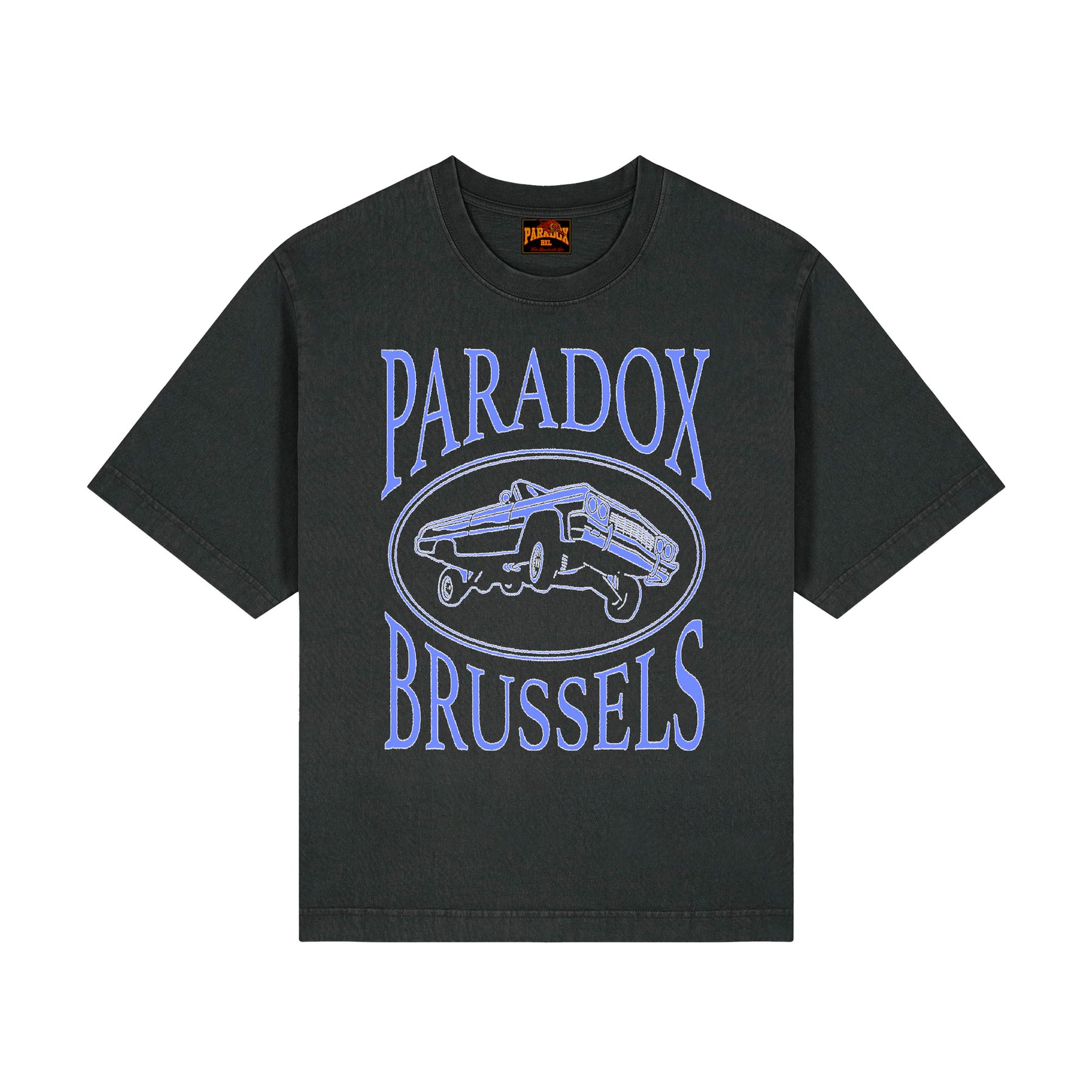 Black cotton T-shirt featuring a large blue screen-print of a lowrider car and the Paradox Brussels inscription on the front.
