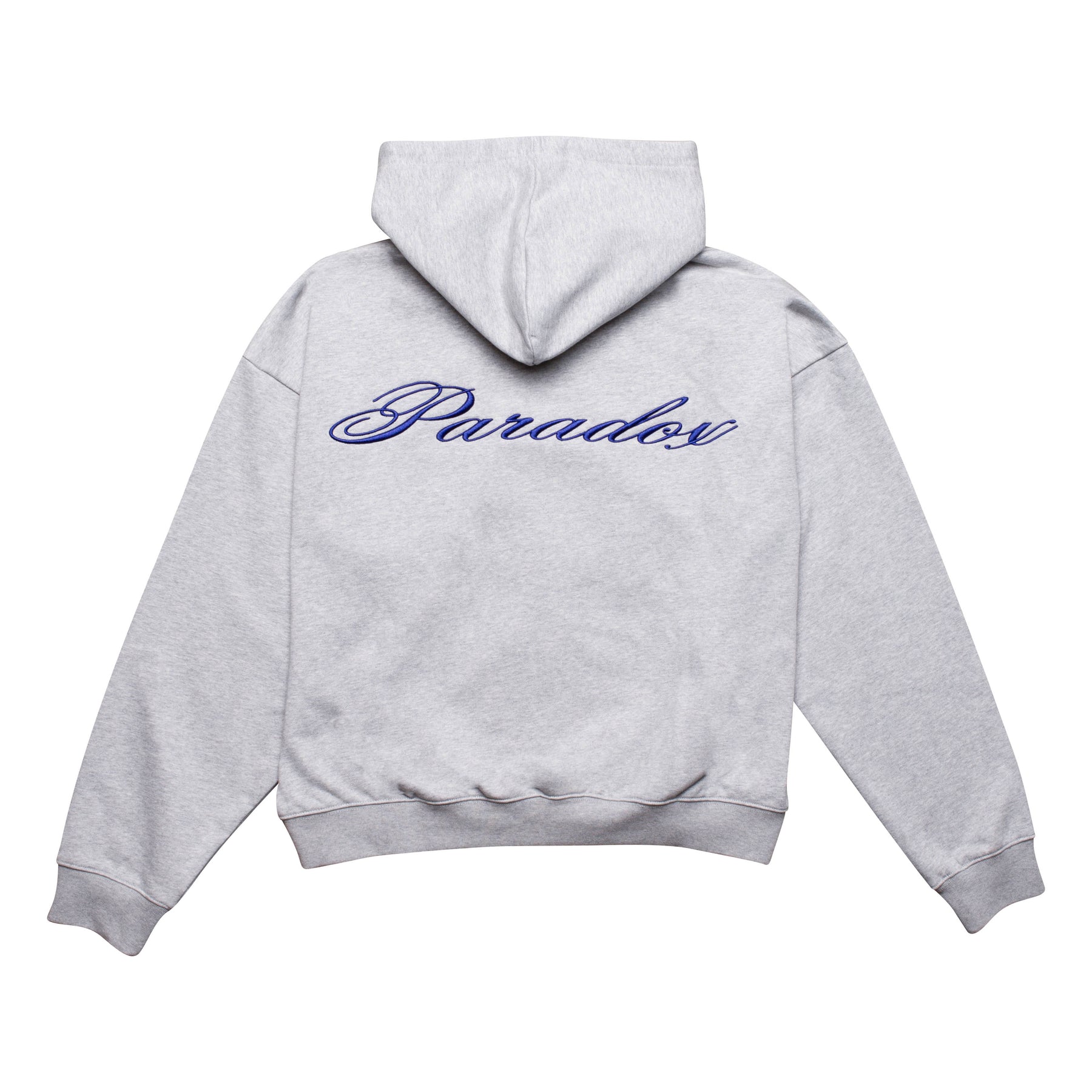 Heather grey zipper hoodie with a royal blue embroidery on front and back.