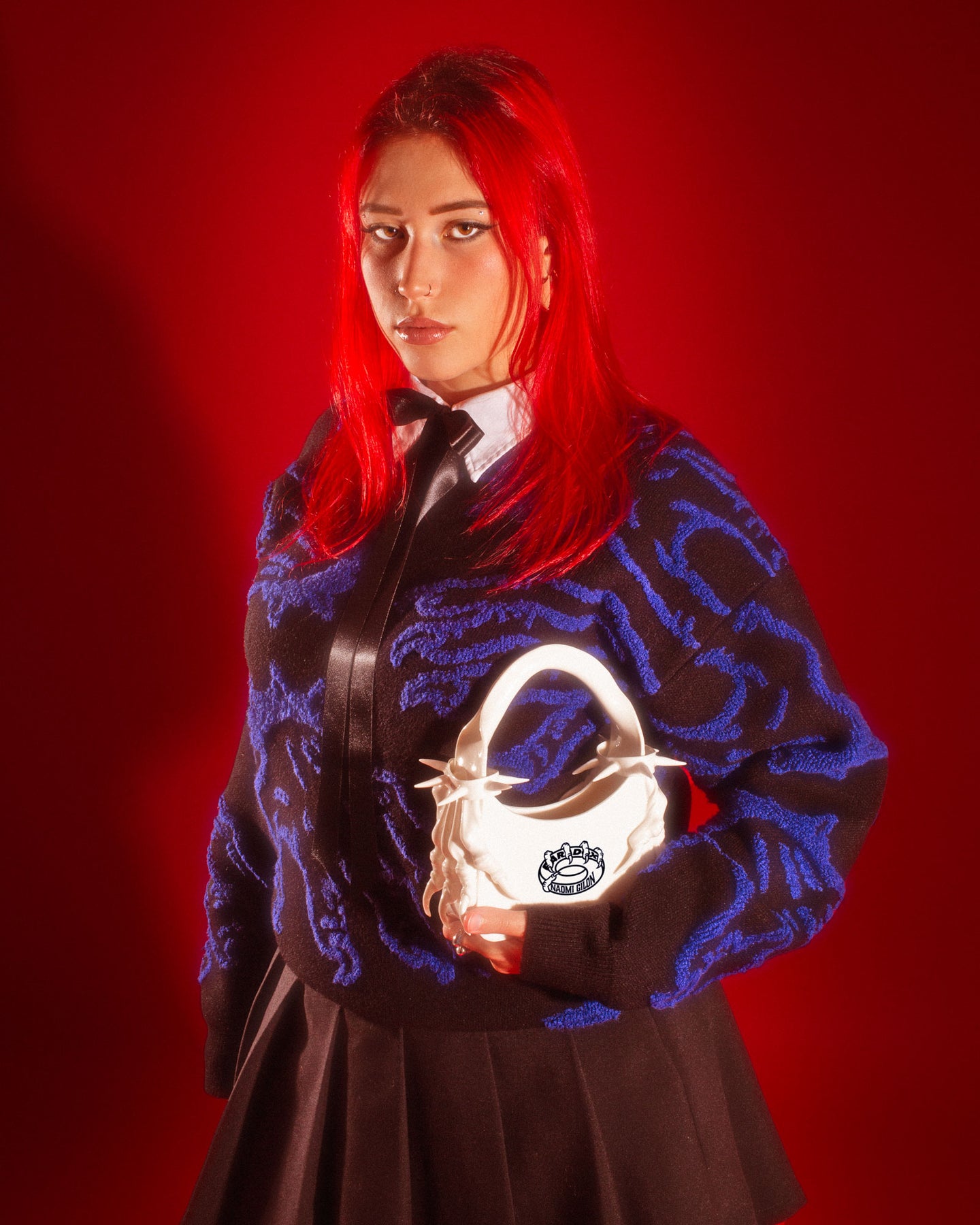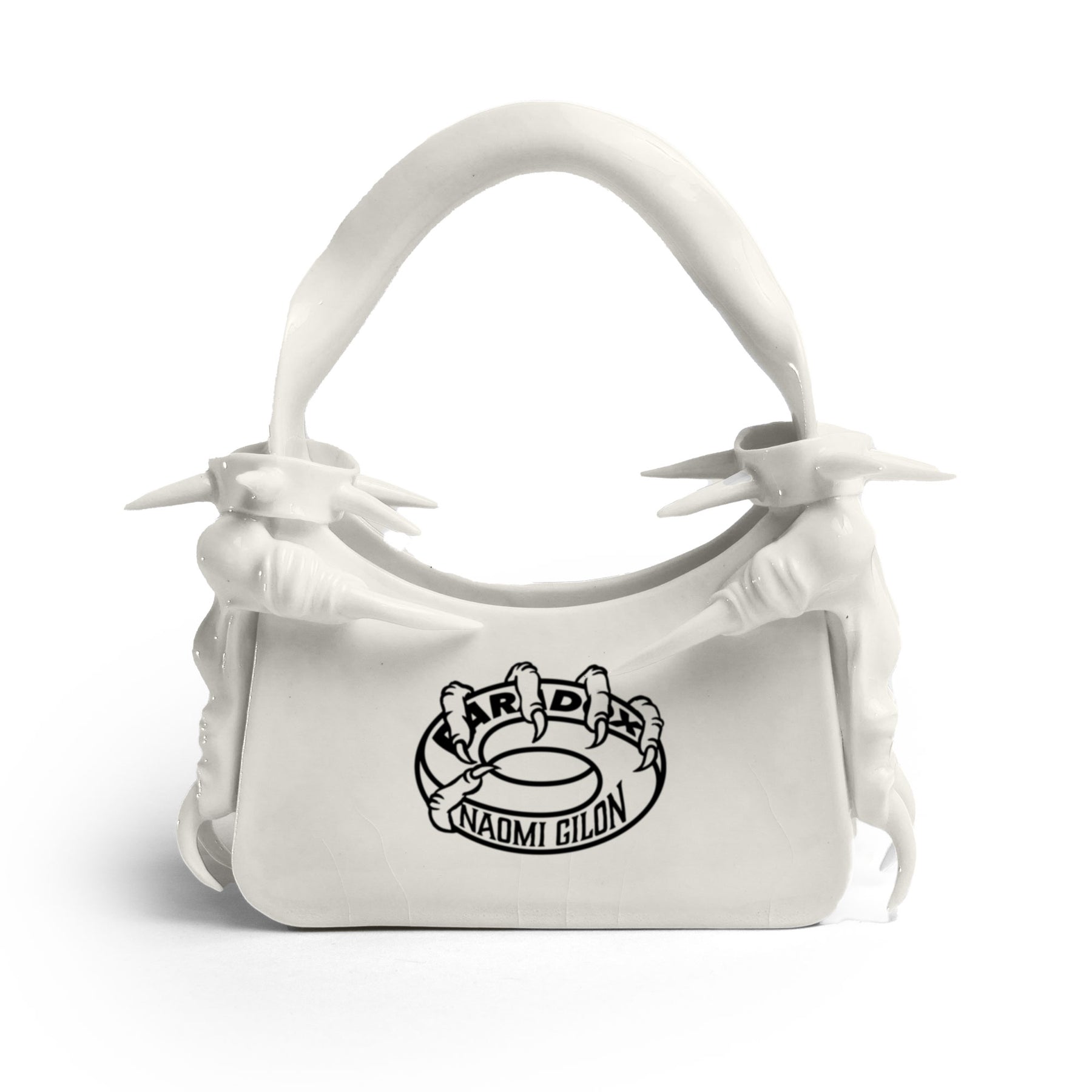 For our collaboration with Naomi Gilon, we chose to create a signature bag design. Naomi crafted a custom porcelain bag, meticulously handmade with unique detail. This one-of-a-kind piece embodies the fusion of our two worlds.