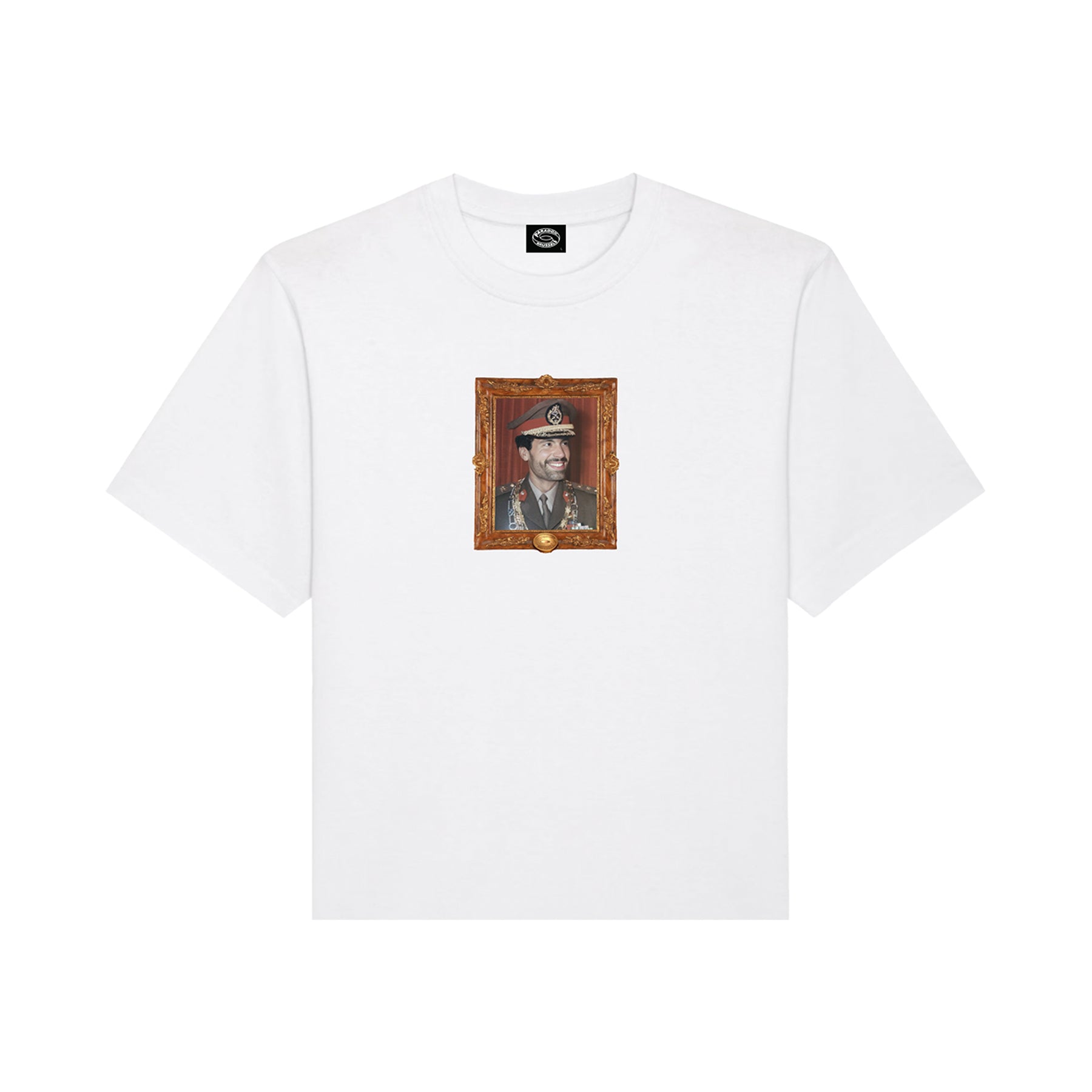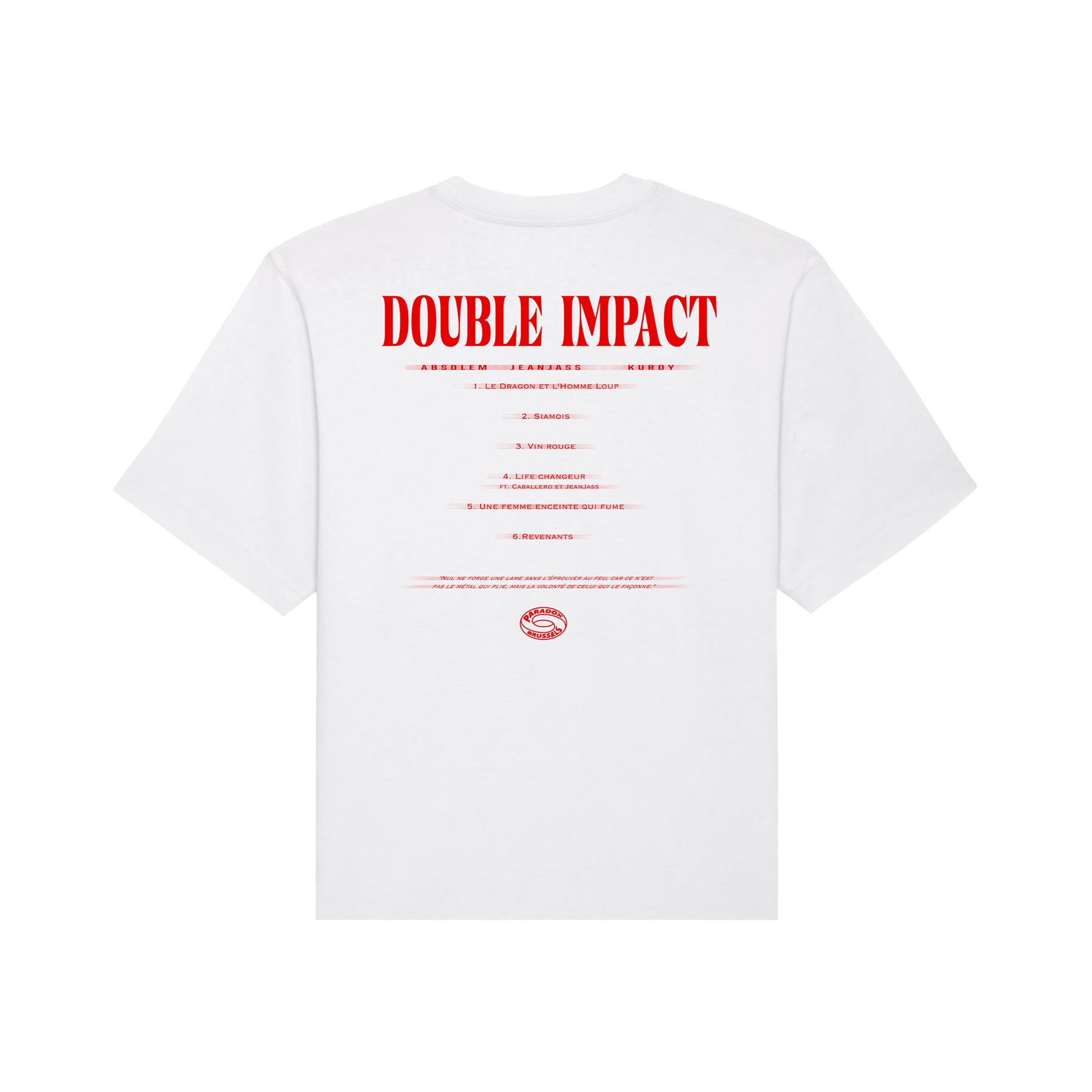 White cotton T-shirt with a screen-printed portrait of the rapper Jeanjass on the front. On the back, the tracklist of his album "Double Impact".