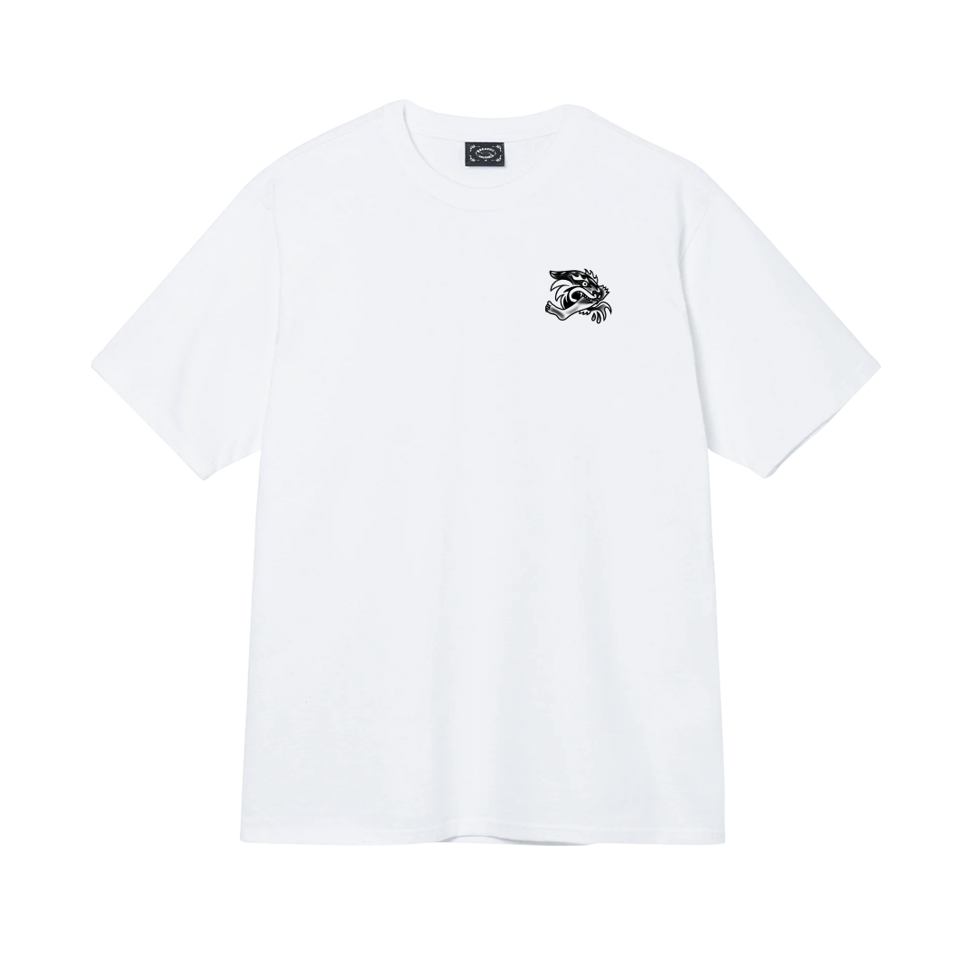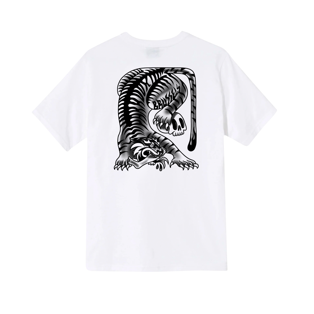 White cotton tee-shirt featuring a large black screen-printed tiger artwork on the back and a smaller matching print over the heart.