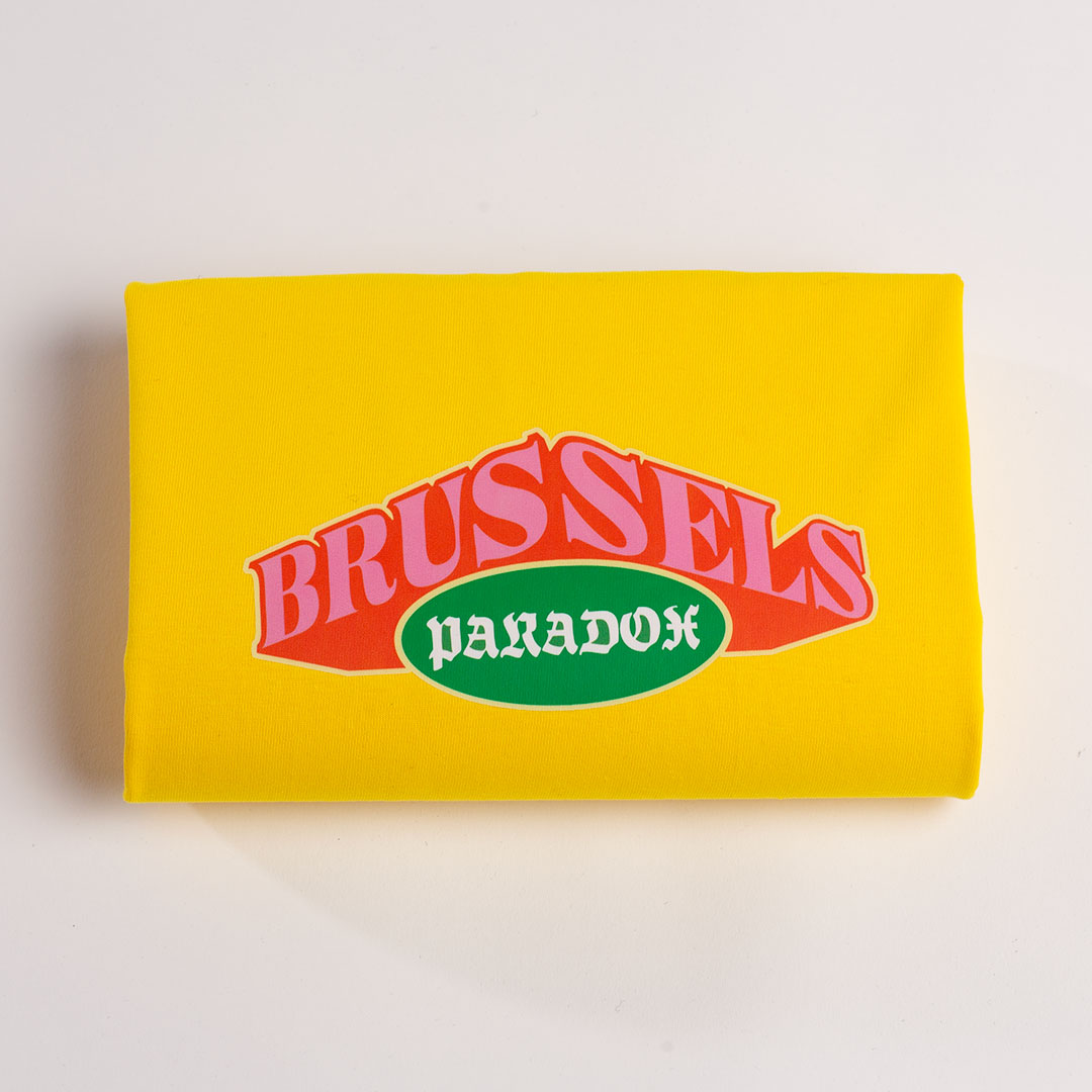 Yellow cotton tee-shirt featuring a Paradox Brussels logo in pink and green, screen-printed on the front.